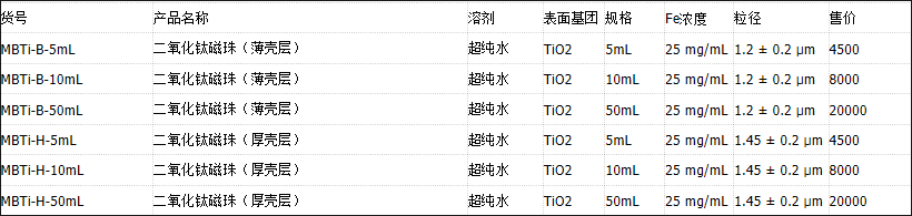 尺寸: 1.2±0.2 μm (薄殼層) 1.45±0.2 μm (厚殼層) 濃度:25mg/ml 溶劑:水 儲存條件 4℃冷藏密封保存,最長保存期限為12 個月。 應用 TiO2磁珠是一種專有的磁性材料微粒載體,能在復雜生物樣品的蛋白消化物中簡單、方便、高效、高特異、高重復性富集磷酸化肽。磁珠表面的二氧化鈦納米粒子對于單磷酸化肽和多磷酸化肽沒有明顯的偏好,因而非常適合單步富集磷酸化肽用于基于質(zhì)譜的蛋白質(zhì)組學分析。