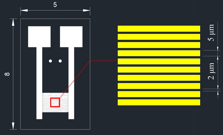 2.線寬: 5um,線距: 2um,指長:1.8mm,叉指對數: 100(200指).