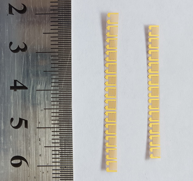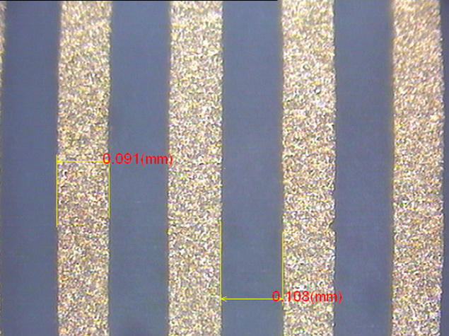 1.基材:聚對苯二甲酸乙二醇酯(PET),厚度75um,外形尺寸3mm*3mm。2.線寬90um,線距110um,指長1.8mm;叉指對數(shù):5對(10指)。3.金屬層結(jié)構(gòu) Cu/Ni/Au,厚度分別為12um,1um,1um。