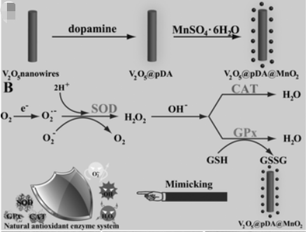 1、V2O5@pDA@MnO2納米復(fù)合材料可以作為一種多納米酶模型來模擬細(xì)胞內(nèi)基于抗氧化酶的防御過程,其中SOD、CAT和GPx共同參與;