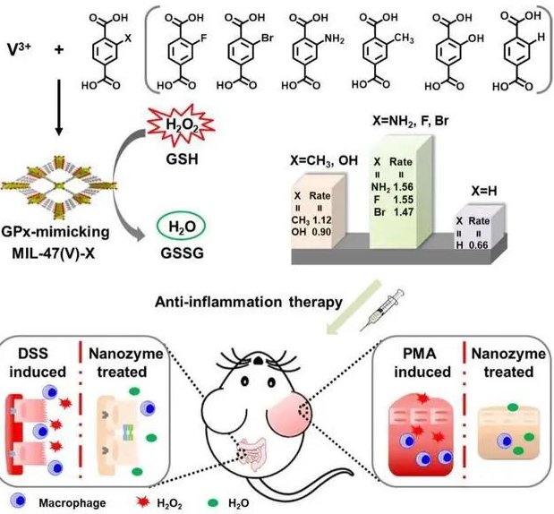 其他說明:密封狀態下保質期半年【主要優勢】通過改變配體從而制備出一系列具有類GPx活性的MOF納米酶,并將其用于老鼠耳朵炎癥和腸炎的治療研究