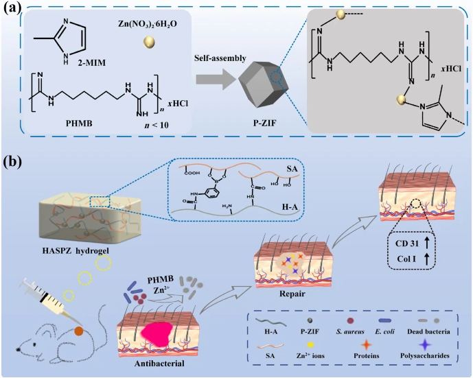 其他說明:密封狀態(tài)下保質(zhì)期半年【主要優(yōu)勢】通過將聚六亞甲基雙胍(PHMB)負載到 ZIF-8 納米粒子的框架中來獲得 pH 響應性抗菌 P-ZIF(ZIF:沸石咪唑酯框架)。這將使 PHMB 能夠在受感染傷口的弱酸環(huán)境中釋放。為了解決燒傷感染問題,將 P-ZIF 納米粒子通過硼酸酯鍵加載到由海藻酸鈉 (SA) 和 3-氨基苯硼酸修飾的類人膠原蛋白 (H-A) 制成的水凝膠系統(tǒng)中