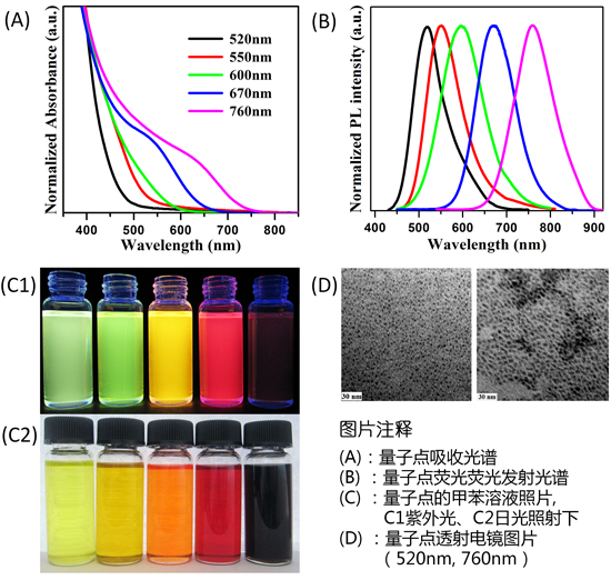 蘇州北科納米科技有限公司生產(chǎn)的油溶性CuInS/ZnS量子點產(chǎn)品是以CuInS為核心,ZnS為殼層,表面由疏水配體包裹的核/殼型熒光納米材料,平均的量子產(chǎn)率為60%,儲存時應(yīng)避免陽光直射,4度密封暗處保存,可以為客戶訂制生產(chǎn)530nm~750nm任一波長不同克數(shù)的產(chǎn)品。本產(chǎn)品具有粒徑均一,吸收光譜寬泛,發(fā)射光譜對稱,熒光強度高而穩(wěn)定等特點,可應(yīng)用于太陽能電池、發(fā)光器件與生物熒光標記等領(lǐng)域。