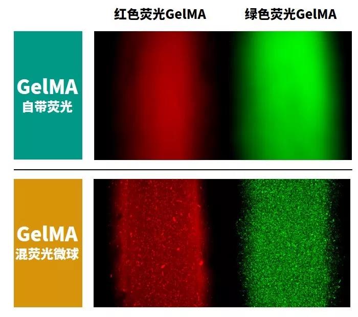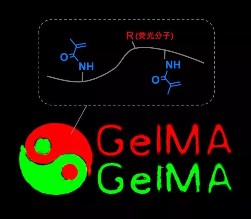 團隊研發(fā)的熒光GelMA是通過在GelMA上“嫁接”熒光分子實現(xiàn)的,因所嫁接熒光分子不同而具有特定的熒光顏色。此化學(xué)標(biāo)記方法避免了物理混合或靜電吸附等方法中熒光分子容易擴散出體系的缺點,,同時也避免了熒光微粒成像不均的缺點。