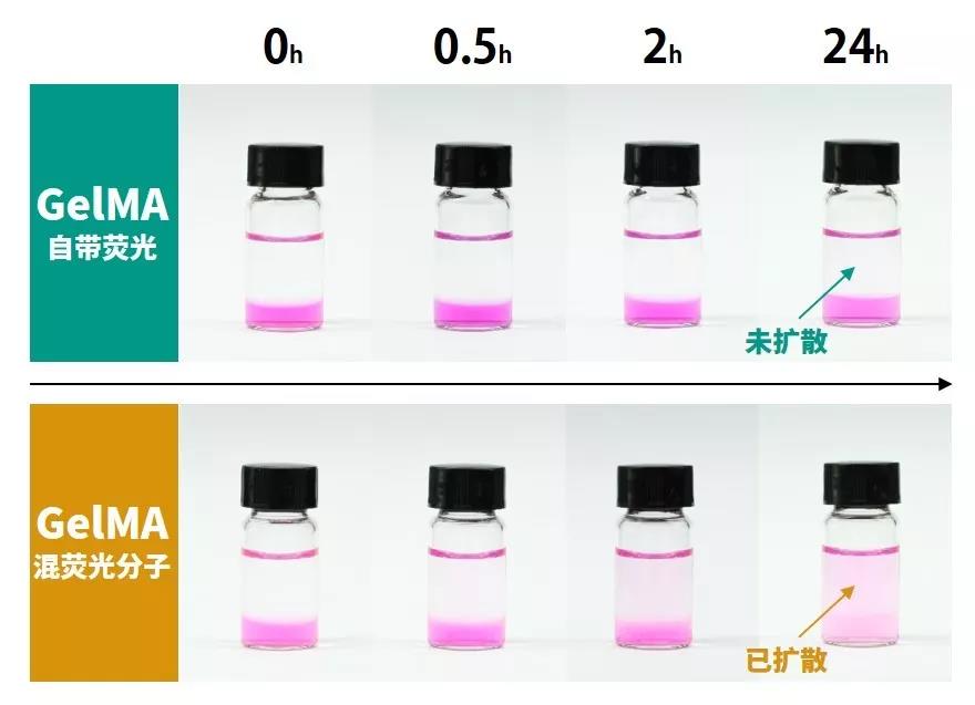 2.熒光GelMA穩(wěn)定不擴散。下圖為自帶熒光和混熒光分子的兩種GelMA擴散對比;鞜晒夥肿拥腉elMA容易擴散;自帶熒光GelMA能長時間保持熒光特性。