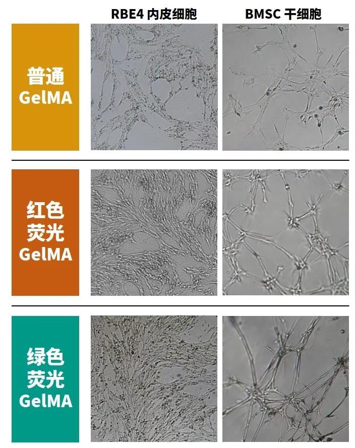 3.熒光GelMA生物相容性優(yōu)異。下圖為使用熒光GelMA和普通GelMA培養(yǎng)內(nèi)皮細(xì)胞(RBE4)和骨干細(xì)胞(BMSC)第五天時的生長狀態(tài),熒光GelMA與普通GelMA具有同等優(yōu)異的生物相容性。