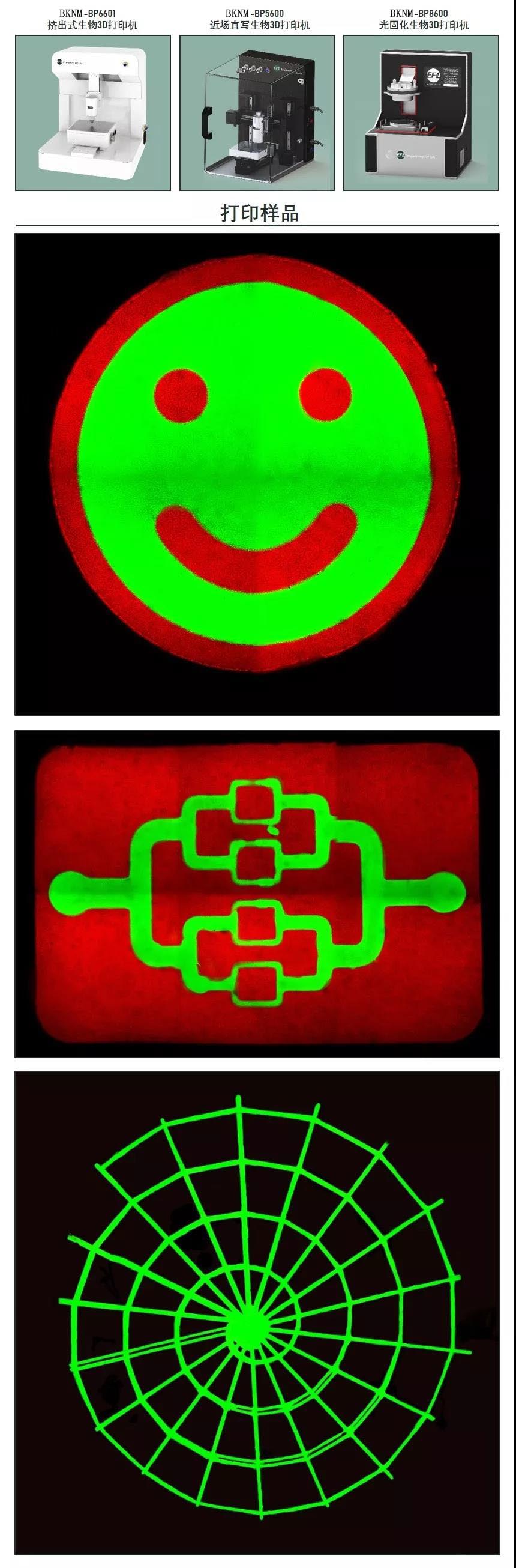 1.3D打印。近年來,GelMA已成為生物3D打印的明星墨水,熒光GelMA可使打印結(jié)構(gòu)的表征更加清晰穩(wěn)定。團隊研制的熒光GelMA可應(yīng)用于全品類生物3D打印機,下圖為BKNM-BP系列生物3D打印機制造的熒光酷炫結(jié)構(gòu)。