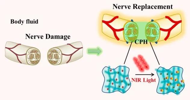 圖 1高柔性和近紅外響應(yīng)導(dǎo)電聚合物水凝膠替代受損的周圍神經(jīng)示意圖
