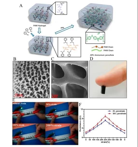 通過聚苯胺(PANI)和聚丙烯酰胺(PAM)的共聚,制備了導(dǎo)電性能優(yōu)良、力學(xué)性能與神經(jīng)組織相似、生物相容性好的堅(jiān)韌導(dǎo)電水凝膠。PAM的酰胺鍵可以與苯胺分子相互作用,可原位吸附并誘導(dǎo)苯胺聚合,形成透明的PAM/PANI導(dǎo)電凝膠。冷凍干燥后,用掃描電鏡(SEM)觀察CPHs的橫斷面形態(tài)。與典型的水凝膠類似,CPHs表現(xiàn)出三維微孔泡沫網(wǎng)絡(luò)。有利于三維水凝膠結(jié)構(gòu)內(nèi)的細(xì)胞穿透和組織形成(圖2B,C)。與此同時(shí),由于PANI的摻雜,制備型CPHs表現(xiàn)出良好的電學(xué)性能,即使它們被延長(zhǎng)到原來長(zhǎng)度的三倍(圖2E,F)。