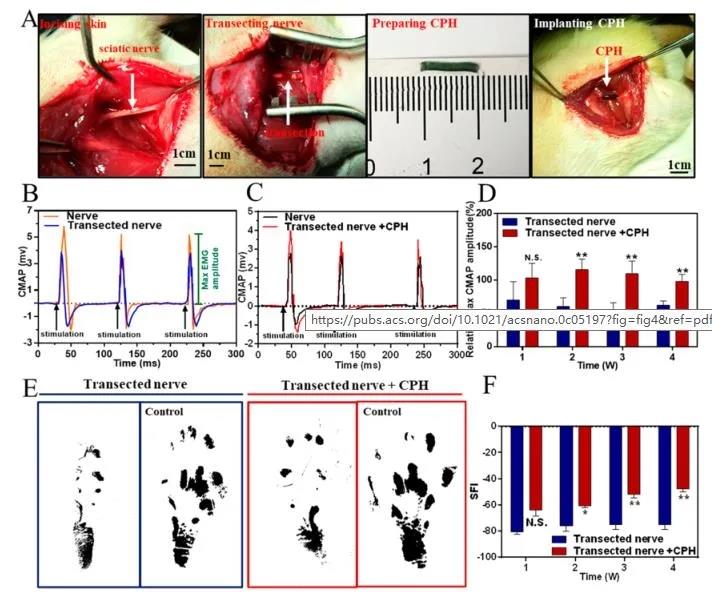 如圖3所示,CPH的電阻率(0.2 - 0.3Ω·米)遠(yuǎn)優(yōu)于PAM,這是由于聚苯胺的摻雜。電化學(xué)阻抗譜(EIS)檢測(cè)了CPH在PBS中的電活性。如圖3B所示,PAM和CPH的Nyquist圖在高頻區(qū)域呈準(zhǔn)半圓形,說明PAM和CPH都具有電荷轉(zhuǎn)移的能力。此外,還模擬了CPH在體內(nèi)替代受損神經(jīng)的可行性和生物電信號(hào)在神經(jīng)中的傳導(dǎo)。如圖3E所示,當(dāng)神經(jīng)完全受損時(shí),生物電信號(hào)無法傳輸。將受損神經(jīng)與CPH連接后,可恢復(fù)生物電信號(hào)傳輸功能。