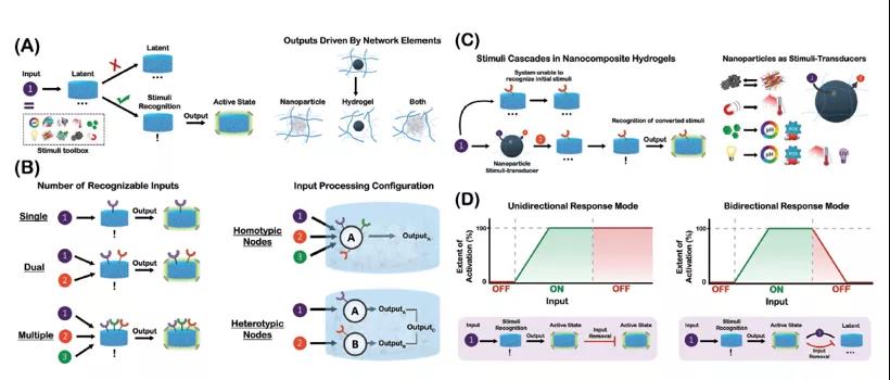圖1. 刺激響應(yīng)型納米復(fù)合水凝膠對(duì)內(nèi)外刺激輸入動(dòng)態(tài)反應(yīng)的過(guò)程。[內(nèi)容解讀]1.納米復(fù)合水凝膠的設(shè)計(jì)和組裝方式納米復(fù)合水凝膠指含有納米材料的水化聚合物網(wǎng)絡(luò),能通過(guò)非共價(jià)相互作用或共價(jià)連接組裝形成。獨(dú)立式體系中只需其中一個(gè)模塊間有相互作用,另一成分作為網(wǎng)絡(luò)填充成分,通過(guò)自交聯(lián)形成更牢固的體系;而共依存體系的組裝需要有水凝膠-NP間的相互作用,得到的復(fù)合凝膠可能是兩成分的加和或協(xié)同作用。復(fù)合體系的組裝方式通常分為四種:(1)水凝膠前驅(qū)液加在預(yù)組裝的NP懸浮液中進(jìn)行交聯(lián),使粒子在支架中預(yù)分布;(2)水凝膠交聯(lián)后原位形成NP;(3)水凝膠交聯(lián)后,預(yù)組裝的納米粒子向內(nèi)擴(kuò)散;(4)通過(guò)納米粒子作為基質(zhì)/網(wǎng)絡(luò)交聯(lián)劑組裝的共依存水凝膠。2.刺激響應(yīng)型納米復(fù)合水凝膠的設(shè)計(jì)方案NP和水凝膠的結(jié)合能形成性能優(yōu)異的體系,通過(guò)刺激響應(yīng)能將性能進(jìn)一步擴(kuò)展。通常復(fù)合水凝膠可以解構(gòu)成NP或水凝膠基質(zhì)等核心成分,作為材料中的刺激響應(yīng)或效應(yīng)模塊,在識(shí)別后以輸出形式引起體系變化。除了對(duì)單刺激產(chǎn)生響應(yīng),生物系統(tǒng)還能配備多種受體對(duì)不同的刺激輸入作出反應(yīng),并根據(jù)組成來(lái)識(shí)別和處理不同數(shù)量的刺激并將其作為初始輸入信號(hào),而納米復(fù)合水凝膠的多組分和分級(jí)結(jié)構(gòu)也有利于通過(guò)結(jié)合水凝膠基質(zhì)和NP來(lái)編碼多種刺激響應(yīng)。開發(fā)這種多刺激反應(yīng)體系對(duì)于改善體內(nèi)藥物運(yùn)輸?shù)拿舾行院晚槕?yīng)性至關(guān)重要。此外,和活細(xì)胞類似,部分NP也能利于自身的轉(zhuǎn)化能力作為智能轉(zhuǎn)化成分,通過(guò)轉(zhuǎn)換結(jié)點(diǎn)將多種刺激有序連接,并通過(guò)NP刺激傳感器對(duì)很多曾經(jīng)無(wú)法識(shí)別的刺激做出響應(yīng)。目前的刺激轉(zhuǎn)換結(jié)點(diǎn)大多來(lái)自作為天然刺激傳感器的納米材料或能承載刺激轉(zhuǎn)換特性的NP。而根據(jù)所識(shí)別的刺激,響應(yīng)分為單向和雙向兩種模式。