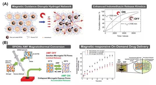 圖4. 磁響應(yīng)型納米復(fù)合水凝膠的按需給藥過(guò)程。[結(jié)論與展望]與靜態(tài)平臺(tái)相比,刺激響應(yīng)型納米復(fù)合水凝膠對(duì)于開發(fā)復(fù)雜的生物功能平臺(tái)有更明顯的優(yōu)勢(shì),正如本文所述,NP和水凝膠結(jié)合的產(chǎn)物顯示了優(yōu)異的設(shè)計(jì)和組裝靈活性,以及對(duì)生物醫(yī)學(xué)性能的增強(qiáng)。但無(wú)論其潛力和發(fā)展焦點(diǎn)多么引人關(guān)注,這種復(fù)合材料目前還未獲得監(jiān)管部門批準(zhǔn)在醫(yī)療保健使用,如何克服從實(shí)驗(yàn)室到臨床之間的障礙,仍是研究中所面臨的重大挑戰(zhàn)。