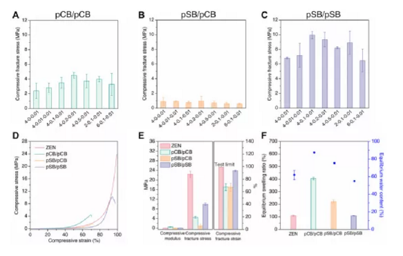 首先對pCB/pCB水凝膠進行了正交壓縮試驗,以檢驗pSB不是主要成分網絡時的效果(圖3,A,D和E)。不出所料,在沒有pSB作為鎖定主要成分網絡的情況下,所有pCB/pCB水凝膠在水中達到平衡后都表現出較大的體積增加(圖3F),從而導致較弱的機械性能。在所有pCB/pCB組合中,最高的斷裂應力僅為pCB /pSB ZEN水凝膠的五分之一。在pSB/pCB系統中(圖3,B,D,E和F),其中pSB是次要組分網絡,由于水凝膠在達到平衡后增加了其原始大小的120%,因此也沒有鎖定作用。斷裂應力僅為1 MPa左右。另一方面,在pSB/pSB系統中(圖3,C至F),如預期的那樣觀察到了鎖定效果,并且平衡體積略有增加,約為7.9%。