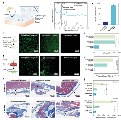 為了減輕生物積垢和術(shù)后炎癥,作者將兩性離子互穿的彈性體層整合在貼劑的非粘合性表面上(圖1a)。已經(jīng)發(fā)現(xiàn)兩性離子聚合物具有優(yōu)異的防污性能。它們獨(dú)特的抗污垢吸附能力歸因于凈中性聚合物鏈中存在陽離子和陰離子基團(tuán),它們促進(jìn)了緊密水合殼的形成,同時(shí)最大限度地減少了游離水分子的氫鍵結(jié)構(gòu)(圖3a)。這種水合殼的能量消耗很高,從而阻止了細(xì)菌和生物分子的表面吸附,這些細(xì)菌和生物分子與諸如感染,血液凝固和術(shù)后粘連形成等炎癥反應(yīng)有關(guān)。然而,兩性離子水凝膠通常具有較差的機(jī)械性能,例如低韌性和可拉伸性,這可能不利于它們?cè)趧?dòng)態(tài)生理環(huán)境中的長(zhǎng)期堅(jiān)固性和穩(wěn)定性。