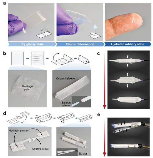 圖4 用于各種手術(shù)末端執(zhí)行器的多層貼片的設(shè)計(jì)和組裝。a)照片顯示處于可塑性變形的干玻璃態(tài)的多層貼劑。b)基于折紙的三角形套管設(shè)計(jì)和制造,用于將多層貼片與球囊導(dǎo)管集成在一起。c)顯示使用食管球囊導(dǎo)管的展開機(jī)制的照片。d)基于折紙的雙套筒適配器的設(shè)計(jì)和制造,用于將多層貼片與鉸接的線性訂書機(jī)集成在一起。e)顯示使用鉸接式線性訂書機(jī)的展開機(jī)制的照片。