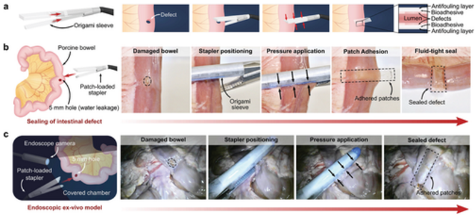 圖6 使用外科縫合器以微創(chuàng)方式遞送和應(yīng)用多層生物粘附貼劑進(jìn)行體外演示。a)使用鉸接式線性訂書機(jī)的貼片整合和遞送過程的示意圖。b)肉眼可見的豬腸道缺陷(5毫米孔)的線性密封,其是通過鉸接的線性縫合器遞送和施用的。c)內(nèi)窺鏡檢查是在黑暗的,有蓋的室內(nèi)進(jìn)行豬腸缺損(5毫米孔)的密封,以模仿微創(chuàng)手術(shù)程序。