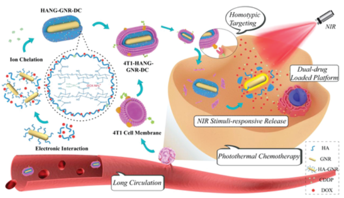 在腫瘤治療領(lǐng)域,納米粒因其獨(dú)特的尺寸效應(yīng)引起了廣泛的關(guān)注。然而納米粒的被動(dòng)靶向效果相對(duì)有限,尤其對(duì)于單一化療藥物的遞送,往往容易引起全身的毒副作用且具有較高的腫瘤復(fù)發(fā)率。近年來(lái),人們?cè)诨煹幕A(chǔ)上,逐漸發(fā)展了多種具有不同特色的腫瘤治療方法,如光熱療法、光動(dòng)力學(xué)療法、饑餓療法等。然而,這些單一的療法都存在一定的缺陷而影響療效,多模式的協(xié)同治療有望革新腫瘤治療所面臨的困境。