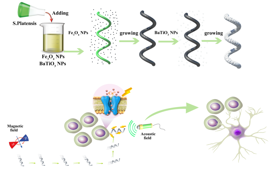 為了解決這一難題,本文作者率先利用生物雜交技術(shù)構(gòu)建了一類(lèi)具有精準(zhǔn)誘導(dǎo)類(lèi)神經(jīng)干細(xì)胞分化的多功能自驅(qū)動(dòng)微納米馬達(dá)系統(tǒng)。通過(guò)在螺旋狀馬達(dá)系統(tǒng)中引入磁響應(yīng)性材料,實(shí)現(xiàn)了馬達(dá)在外加磁場(chǎng)下的精準(zhǔn)運(yùn)動(dòng),從而定點(diǎn)到達(dá)預(yù)定的類(lèi)神經(jīng)干細(xì)胞表面。將超聲與壓電材料相結(jié)合,利用超聲所產(chǎn)生的機(jī)械應(yīng)力來(lái)誘導(dǎo)馬達(dá)表面的壓電材料,使其產(chǎn)生直流電輸出,從而促進(jìn)細(xì)胞在刺激位點(diǎn)形成軸突并實(shí)現(xiàn)分化。這是目前世界上首個(gè)利用磁控壓電功能來(lái)精準(zhǔn)誘導(dǎo)類(lèi)神經(jīng)干細(xì)胞精準(zhǔn)分化的報(bào)道。該體系巧妙地整合了可控運(yùn)動(dòng)、無(wú)創(chuàng)誘導(dǎo)神經(jīng)干細(xì)胞分化等多種功能,在單細(xì)胞水平上實(shí)現(xiàn)了信號(hào)的精準(zhǔn)輸入,有望解決當(dāng)前神經(jīng)干細(xì)胞分化缺乏精準(zhǔn)控制的挑戰(zhàn)。論文鏈接:https://onlinelibrary.wiley.com/doi/10.1002/advs.201903642https://onlinelibrary.wiley.com/doi/10.1002/adfm.201910108
