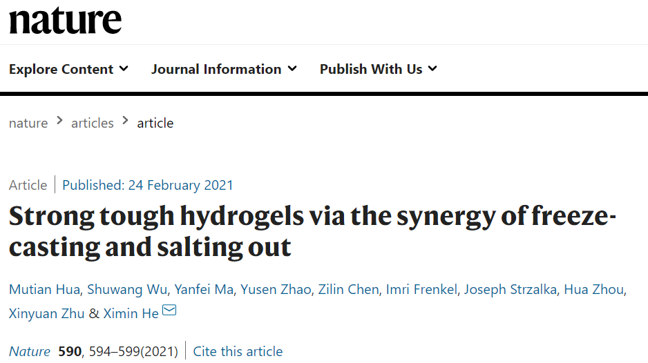 參考文獻(xiàn):Hua, M., Wu, S., Ma, Y. et al. Strong tough hydrogels via the synergy of freeze-casting and salting out. Nature 590, 594–599 (2021).https://doi.org/10.1038/s41586-021-03212-z