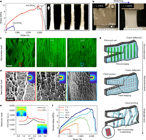 1)首先,研究人員使用了一種稱為“冷凍澆鑄”的方法,這種固化過(guò)程會(huì)產(chǎn)生類似于海綿的多孔且濃縮的聚合物。2)其次,他們使用“鹽析”處理將聚合物鏈聚集并結(jié)晶成堅(jiān)固的原纖維。由此產(chǎn)生的新型水凝膠具有一系列跨越多個(gè)不同尺度的連接結(jié)構(gòu)(從分子水平到幾毫米)。這些多重結(jié)構(gòu)的層次結(jié)構(gòu)類似于生物對(duì)應(yīng)結(jié)構(gòu),使材料更堅(jiān)固、更可拉伸。