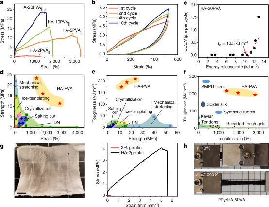 這些水凝膠的水含量為70%-95%,但其性能優(yōu)于其他堅(jiān)韌水凝膠甚至天然肌腱;例如,極限應(yīng)力為23.5±2.7 MPa,應(yīng)變水平達(dá)2900±450%,韌性為210±13 MJ/m3,斷裂能為170±8 kJ/m3,疲勞極限為10.5±1.3 kJ/m2。除了生物醫(yī)學(xué)應(yīng)用之外,由于水凝膠的靈活性,這種進(jìn)步還可能為操作無(wú)數(shù)次循環(huán)的外科手術(shù)機(jī)器或生物電子學(xué)以及以前無(wú)法實(shí)現(xiàn)的3D打印帶來(lái)潛力。
