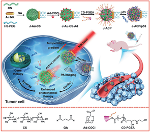 (1)實驗利用Janus結(jié)構(gòu)的主動運動性、多糖結(jié)構(gòu)域的選擇性表面功能化以及金納米棒的光熱效應(yīng)構(gòu)建了具有Janus結(jié)構(gòu)的殼聚糖/金納米雜化體(J-ACP)。研究表明,由聚陽離子殼聚糖納米球和聚乙二醇化金納米棒組成的近紅外響應(yīng)型J-ACP可以實現(xiàn)光聲(PA)成像指導(dǎo)的互補(bǔ)型光熱治療(PTT)-基因治療。