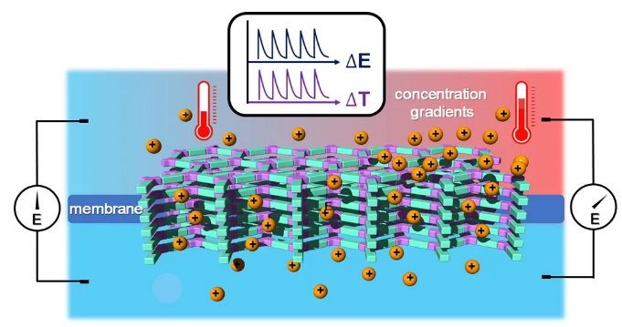 感知溫度對(duì)生物體維持正常的生命活動(dòng)至關(guān)重要。在哺乳動(dòng)物中,熱刺激通過(guò)熱敏感受器(thermo-TRP)離子通道轉(zhuǎn)化為電化學(xué)電位,然后通過(guò)神經(jīng)細(xì)胞轉(zhuǎn)化為動(dòng)作電位,如疼痛感的產(chǎn)生。從仿生學(xué)角度出發(fā),在體外模擬熱信號(hào)的傳導(dǎo),設(shè)計(jì)恰當(dāng)?shù)募{米通道將化學(xué)信號(hào)轉(zhuǎn)化為電信號(hào),或是在人工系統(tǒng)中植入熱活性分子來(lái)調(diào)節(jié)熱感覺,設(shè)計(jì)仿生“溫度計(jì)”,是科學(xué)家們長(zhǎng)久以來(lái)的研究熱點(diǎn)。此外,實(shí)現(xiàn)可逆的熱響應(yīng)性,并且只在溫度達(dá)到熱轉(zhuǎn)變溫度時(shí)起作用,將溫度響應(yīng)限制在微小范圍內(nèi)成為了研究難點(diǎn)。浙江大學(xué)孫琦教授團(tuán)隊(duì)聯(lián)合北德克薩斯州大學(xué)馬勝前教授團(tuán)隊(duì)創(chuàng)造性地制備了一種基于離子共價(jià)有機(jī)框架(COF)的納米流控膜,它能夠智能地監(jiān)測(cè)溫度變化,并以連續(xù)電位差的形式顯示出來(lái)。亞納米通道存在高密度的電荷位點(diǎn),使得膜層具有高選擇性和高達(dá)1.27 mV K-1的熱感覺靈敏度。該系統(tǒng)還具有良好的耐鹽性,工作溫度寬,對(duì)溫度刺激的同步響應(yīng),以及長(zhǎng)期超穩(wěn)定性的優(yōu)勢(shì)。該研究以題為“Covalent organic framework nanofluidic membrane as a platform for highly sensitive bionic thermosensation”的論文發(fā)表在最新一期《Nature Communications》上。