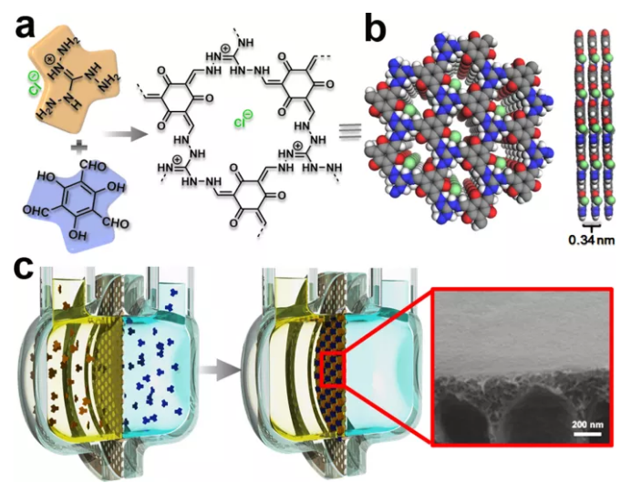 圖1作為仿生溫度計(jì)的離子共價(jià)有機(jī)框架納米流控膜高離子密度有利于產(chǎn)生單極離子環(huán)境,而德拜屏蔽長(zhǎng)度是取決于溶液離子強(qiáng)度的特征長(zhǎng)度(離子強(qiáng)度越高,德拜長(zhǎng)度越小)。因此,COF孔徑越小、荷電密度越高,選擇性更好。為了模仿thermo-TRP離子通道,選用1,3,5-三甲酰基間苯三酚(Tp)與鹽酸三氨基胍(Tag)縮合成的COF作為納米流控系統(tǒng)(Fig.2a,b)。