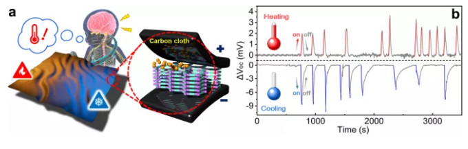 圖5 (a)設(shè)計(jì)具有熱感覺能力的智能紡織品的示意圖。(b)實(shí)時(shí)測(cè)量電位的變化,對(duì)應(yīng)施加的溫度梯度(紅色,加熱;灰色、加熱/冷卻;藍(lán)色,冷卻)。總之,作者制備了COFs膜作為高效熱傳感器,利用膜的離子選擇透過(guò)性,證明了COF亞納米通道可以模擬在自然界中觀察到的熱響應(yīng)離子通道。作者表示基于這項(xiàng)研究結(jié)果,目前正在開發(fā)一種能夠檢測(cè)環(huán)境溫度的人造皮膚。這項(xiàng)工作在熱敏反應(yīng)器件的發(fā)展中邁出了重要的一步。