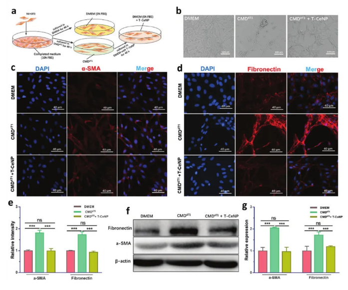 (2)隨后,T - CeNP有效地阻止了與癌癥相關的成纖維細胞轉分化,并將其重新編程成正常的成纖維細胞。