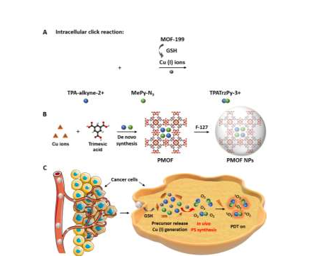 本文要點(diǎn):(1)MOF-199是一種基于Cu(II)的金屬有機(jī)骨架,可作為惰性載體負(fù)載PSs前體以實(shí)現(xiàn)高效遞送。同時(shí),它也能夠作為Cu(I)催化劑原料,進(jìn)而用于原位點(diǎn)擊反應(yīng)以在癌細(xì)胞中形成PSs。