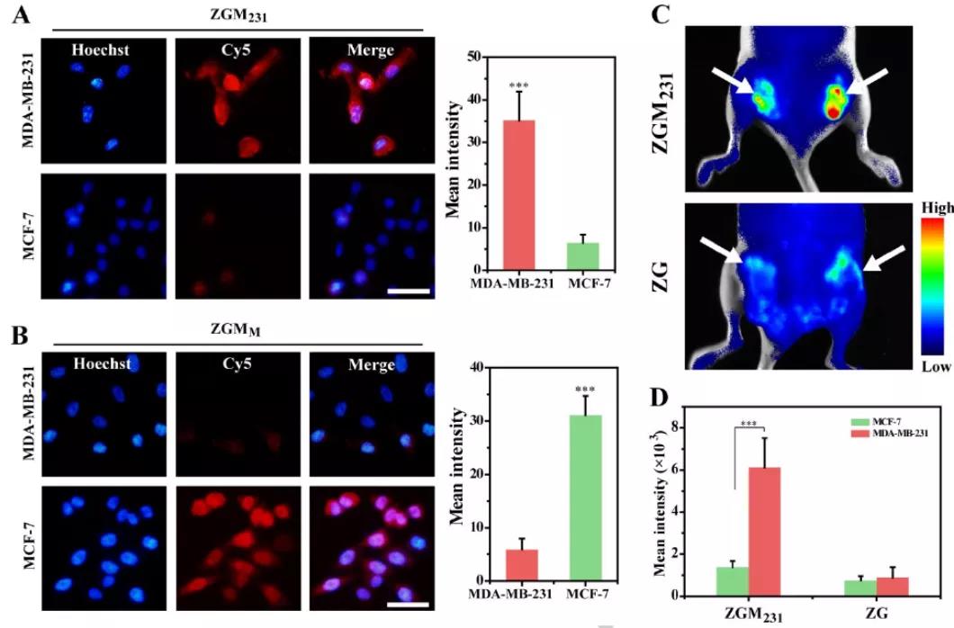 本文要點:(1)該仿生平臺具有豐富的受體,不僅可以選擇性地靶向同型細胞,還可以實現對不同乳腺癌亞型的選擇性MGL。此外,具有內溶酶體逃逸性能的ZIF-8可使得疊氮糖從溶酶體中逃逸并加速其代謝整合。