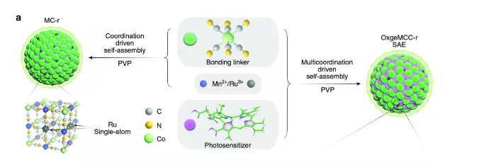 1、單原子納米酶用于光動力治療[1]光動力治療(PDT)是指光敏劑在接受一定波長的激光照射之后產生大量活性氧(ROS)來實現對癌細胞的氧化損傷,憑借其可控性強、副作用低等優勢被廣泛應用到癌癥治療等領域。這種療法依賴于局部的O2分子來產生高細胞毒性的單態氧(1O2),但實體腫瘤缺氧微環境會影響光動力療法的治療效果。為了解決上述問題南洋理工大學趙彥利研究團隊設計了一種安全、高效的自組裝納米制劑,單原子納米酶(OxgeMCC-r)。研究者通過一步自組裝技術將具有類過氧化氫酶活性的釕原子固定在Mn3[Co(CN)6]2多孔材料中,同時將光敏劑Ce6包覆在MOFs材料中。該復合納米酶具有可控的尺寸和形貌,較高的負載能力。在腫瘤部位OxgeMCC-r納米酶催化內源性的過氧化氫產生氧氣,有效的緩解了腫瘤內部的乏氧環境,顯著性提高了光動力治療效果,體外和體內實驗都證明了OxgeMCC-r納米酶優異的抗腫瘤效果,與此同時復合納米酶中的Mn2+可以用于T1磁共振成像能力。OxgeMCC-r SAE具有較高的Ce6負載能力、優越的催化性能和體內跟蹤成像能力,將是一種很有前景的抗腫瘤藥物,促進不同單原子納米酶在催化納米醫學領域進一步發展。
