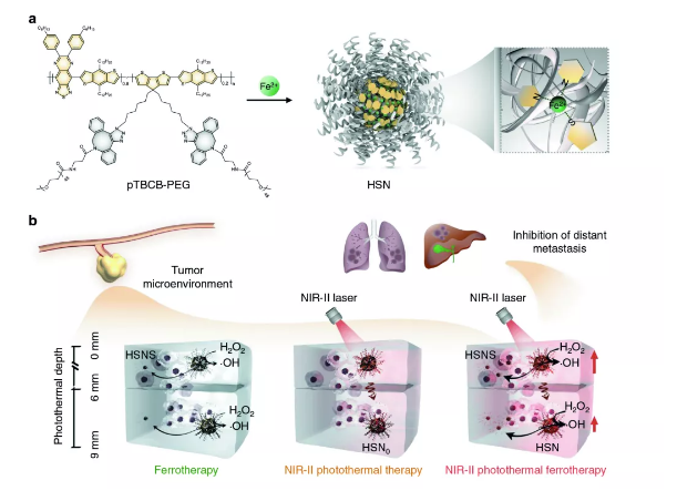 圖1. 單原子納米酶OxgeMCC-r的合成示意圖。2、半導體納米酶用于光熱鐵劑治療[2]鐵劑治療在癌癥治療方面具有廣闊的應用前景,其原理是金屬離子2價鐵離子介導的芬頓反應將癌細胞微環境中的過氧化氫轉化為毒性的羥基自由基,從而實現對癌細胞的損傷。但芬頓反應在腫瘤微環境中催化效率低,一定程度上限制了材料的進一步應用。為解決以上難題,南洋理工大學浦侃裔研究團隊合成了基于有機半導體聚合物(pTBCB-PEG)和Fe2+絡合的半導體納米酶(HSN)用于光熱鐵劑療。納米復合酶的設計增強了其在近紅外二區的成像效果,在近紅外光的照射下,HSM通過光熱效應引起癌細胞死亡,一方面增強芬頓反應,促進過氧化氫的分解和毒性羥基自由基的形成,另外一方面分解產生的自由基將42 nm的納米粒子分解為1.7 nm的微小粒子,增加了其瘤內滲透率,在協同作用下極大提升了納米酶的抗腫瘤能力和抑制腫瘤轉移能力,在體內小鼠實驗得到。該項研究不僅將無創的光熱治療的組織深度提高到一個新水平(9 mm),而且也揭示了光熱鐵劑治療的機制。最重要的是納米酶的適用范圍可以推廣到其他深度組織病變,比如神經退行性疾病,為新型納米酶提供了更加廣泛的生物醫用前景。