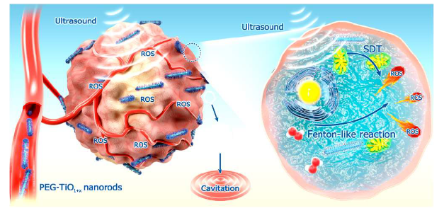 圖2. 半導體納米酶(HSN)合成示意圖與HSN介導的光熱治療和鐵劑治療的對比。3、超細納米酶用于增強的聲動力治療[3]聲動力治療是指利用超聲波極強的組織穿透性來實現無創的新型治療方法。聲敏劑在達到靶點時在超聲波的作用下產生活性氧,從而實現精準、可控的治療效果。二氧化鈦是一種廣泛研究的聲敏劑,具有較高的穩定性和較低的毒性。但純的二氧化鈦納米粒子的活性氧量子產率較低,削弱了其治療效果;诖蘇州大學程亮研究團隊通過種子介導的生長機制設計了一種具有優異聲敏性能和辣根過氧化物活性的一氧化鈦納米棒(PEG-TiO1+x NRs),其缺氧結構導致更強的活性氧產生能力,更有趣的是PEG-TiO1+x NRs具有納米酶的性質,高效地催化內源性過氧化氫產生羥基自由基,誘發癌細胞凋亡和壞死,腫瘤在聲動力和化學動力協同治療下被有效抑制,其抑制效果明顯優于二氧化鈦納米聲敏劑,同時PEG-TiO1+x NRs納米酶沒有明顯的毒副作用,為設計新型的聲敏劑提供了新思路,在腫瘤治療領域具有廣闊的應用前景。