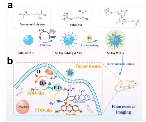 圖3. PEG-TiO1+x NRs納米粒子作為聲敏劑用于聲動力和化學動力治療示意圖。4、納米酶凝膠用于熒光成像[4]水凝膠作為一類具有三維網絡結構和良好生物相容性的親水凝膠被應用于生物醫學領域。將仿生酶和天然酶包裹在水凝膠體系中的已成為生物研究的熱門話題,因為它可以保護酶的結構改變和隨后可能的失活,確保更高的負載和更好的底物流動性,從而實現高效的催化。盡管在大凝膠制備技術方面已有較好的研究成果,但如何在有限的納米空間內進行修飾或組裝獲得雜化納米凝膠仍然是一個挑戰。基于此同濟大學王啟剛研究團隊本文以過渡金屬Fe (II)離子配位生物相容性丙烯;嚢彼峋酆衔锼榛A,采用酶催化原子轉移自由基聚合(ATRPase)方法制備了金屬交聯聚合物納米凝膠(MPGs)體系。MPGs中單原子、高分散的鐵離子既是凝膠網絡的高效交聯劑,也是超氧化物歧化酶(SOD)和過氧化物酶(POD)活性的多酶模擬活性中心,與傳統鐵基納米酶的催化活性相當,熱穩定性高于分子酶模擬物和天然辣根過氧化物酶。細胞和動物實驗證實MPGs納米酶凝膠可以實現高效的活性氧響應的生物熒光成像,同時具有較好的生物相容性,有望進一步應用到熒光成像、藥物遞送和其他醫學領域。
