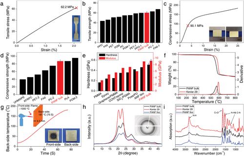 圖3 密度為 1.40 g cm−3 的 PANF 塊體的性質和結構分析。a)PANF塊體的典型拉伸應力-強度曲線。插圖是啞鈴形PANF散裝樣品;比例尺:5 毫米。b) PANF 塊體和五種工程塑料的拉伸強度比較。c)PANF塊體的典型壓應力-應變曲線。插圖是壓縮前后的 PANF 塊;比例尺:2 毫米。d) PANF 本體與其他塑料或聚合物基復合材料的抗壓強度比較。e)PANF本體與其他塑料或聚合物-基體復合材料在硬度和彈性模量方面的比較,以納米壓痕為特征。(b)、(d) 和(e)中的誤差線是通過對不同測試樣本的平均值獲得的。f) PANF 塊體和 Kevlar 29 的熱重分析 (TGA) 和微分熱重分析 (DTA) 曲線。g) 火焰下(約 1000 °C)PANF 塊體板(厚度 = 6.5 mm)的背面溫度。插圖為經測試后的PANF散裝板的正反面;比例尺:20 毫米。h) PANF塊體、Kevlar 29和PANF絮體的XRD圖譜。插圖顯示了 PANF 塊體的衍射圖像。i) PANF 本體、Kevlar 29 和 PANF 絮狀物的 FTIR 光譜。