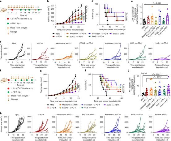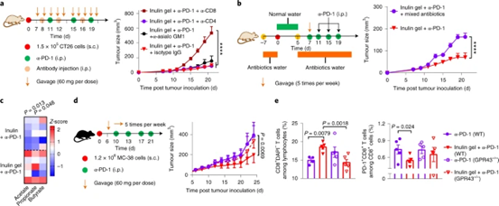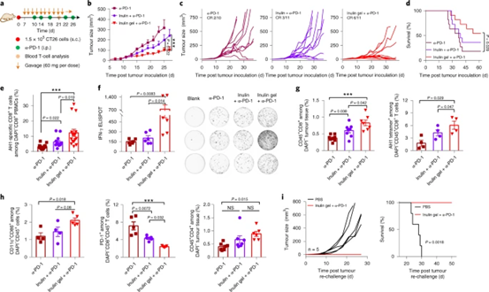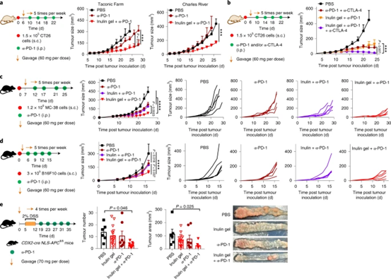 圖 8:菊粉凝膠加 α-PD-1 療法在多種腫瘤模型中的療效。
