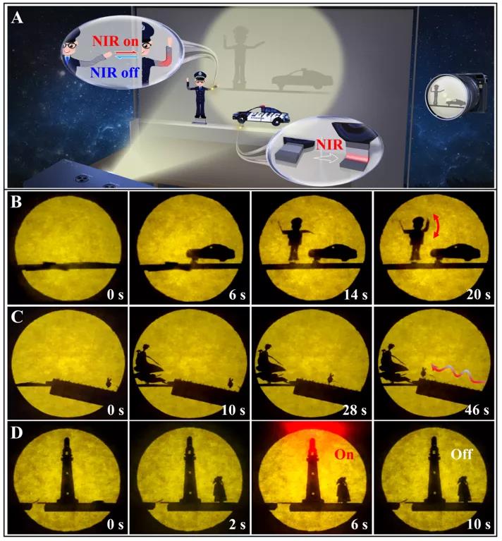 研究人員還通過組裝形狀記憶行為的LM-SMP與導(dǎo)電形狀可變形的LM-LCN致動器集成了光控可編程機(jī)器人皮影戲,所有的運(yùn)動都投射到觀眾觀察的屏幕上(如圖3)。其中指揮交通的警察由形狀可逆LM-LCN(手)和形狀不可逆LM-SMP(身體)致動器制成,開始時(shí)警察和汽車陰影在水平狀態(tài)對屏幕均不可見,NIR光照射時(shí),LM-SMP鉸鏈的光熱誘導(dǎo)不可逆變形導(dǎo)致屏幕上先后出現(xiàn)汽車和警察的影子。警察的一只手以LM-LCN執(zhí)行器作為肘關(guān)節(jié),可以通過循環(huán)NIR光照射表現(xiàn)出可逆的揮手手勢。第二個(gè)機(jī)器人皮影戲的靈感來自中國傳說中嫦娥奔月的傳說,展示了一只玉兔走向美人的場景。在NIR輻射下,美人腳上的LM-SMP鉸鏈的光熱誘導(dǎo)不可逆變形導(dǎo)致了她的出現(xiàn)。光驅(qū)動的玉兔走向美女是由LM-LCN執(zhí)行器在循環(huán)近紅外輻射下在棘輪天梯上移位觸發(fā)的。最后一個(gè)皮影戲基于LM-LCN和LM-SMP軟致動器以及膠體LM涂層的導(dǎo)電性,展示了一個(gè)詩人仰望閃亮燈塔的場景。人影的出現(xiàn)同樣基于LM-SMP鉸鏈的近紅外輻射,燈塔頂部的紅色LED則基于NIR光驅(qū)動的導(dǎo)電LM-LCN薄膜的彎曲變形可逆地切換,使電路連通或斷開。