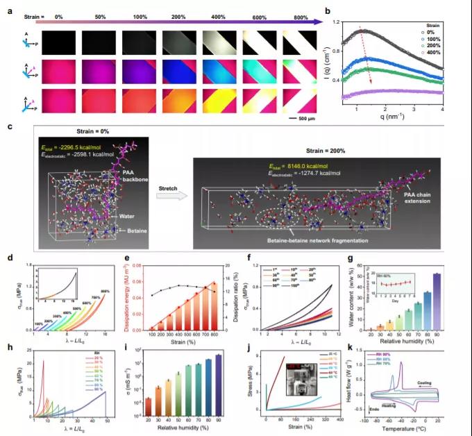 與依賴大量溶劑使用的水凝膠和離子凝膠不同,目前的離子彈性體只存在平衡含水量。這一特性使得分子間二聚體氫鍵足夠強,可以在常溫下交聯(lián)多羧酸鏈,同時當浸泡在高濕度中時會變得動態(tài),從而實現(xiàn)完全的自愈合,此外,由弱配合兩性離子組成的兩性網(wǎng)絡有助于離子彈性體的初始柔性,隨后在拉伸過程中會碎裂,從而形成一個非常堅硬的氫鍵合的聚羧酸網(wǎng)絡。