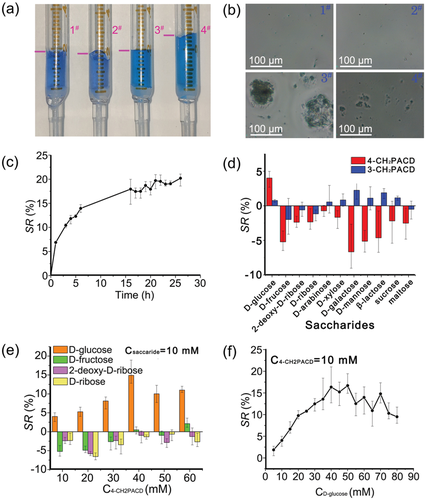 雙齒 β-CD 通過三個簡單的反應很容易合成,從 DMβCD 和對(溴甲基)苯基硼酸開始。雙齒β-CD的形成過程被發(fā)現(xiàn)是尺寸選擇性的,因為從間(溴甲基)苯基硼酸試劑中,不能提供雙齒β-CD衍生物。雙齒 β-CD(即 4-CH2PACD)包含葡萄糖狹縫,并顯示出與 D-葡萄糖的高效特異性結(jié)合。合成的 4-CH2PACD 被摻雜到 PAAm 水凝膠中,賦予水凝膠對 D-葡萄糖的特異性反應。具體而言,當凝膠在 D-葡萄糖溶液中平衡時,水凝膠的膨脹是可見的,而在 D-葡萄糖異構體(如 D-果糖和 D-半乳糖)溶液中則收縮。發(fā)現(xiàn)這種特征有利于自我調(diào)節(jié)的特定葡萄糖響應性胰島素釋放,因為溶液中高濃度的 D-葡萄糖會導致凝膠膨脹并增加網(wǎng)格尺寸。體內(nèi)試驗表明,在 T1DM 中預加載雙齒 β-CD 和短活性胰島素的 PAAm 水凝膠能夠?qū)崿F(xiàn)長期持續(xù)的血糖控制。預計這種簡便的合成方法將為雙齒 β-CD 作為各種重要生物化合物或代謝物的受體的合成打開一扇新的大門。考慮到 β-CD 與許多生物或藥物活性化合物之間的多功能主客體內(nèi)含物,以及雙齒 β-CD 與靶向生物分子之間的特定相互作用,為 DSGTIR 開發(fā)了一種新機制。