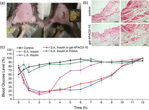 最近,鄭州大學基礎醫(yī)學院梅英武副教授,陜西科技大學Renqi Wang博士、陳詠梅教授團隊共同提出了一種仿生葡萄糖觸發(fā)-胰島素釋放系統(tǒng),即一種預載胰島素的雙齒 β-環(huán)糊精基水凝膠;雙自我調(diào)節(jié)系統(tǒng)顯示特定的 D-葡萄糖反應,以實現(xiàn)準確監(jiān)測和同時按需觸發(fā)胰島素釋放。D-葡萄糖與雙齒β-環(huán)糊精之間的特異性結(jié)合誘導質(zhì)子的釋放,導致水凝膠的宏觀膨脹,隨后觸發(fā)胰島素的按需和長期補充。相反,D-葡萄糖的異構體,如 D-果糖和 D-半乳糖,會導致水凝膠收縮,并延遲胰島素釋放。I 型糖尿病小鼠模型的體內(nèi)研究確定,雖然雙齒 β-CD 水凝膠預裝了短效胰島素,但它可以在12小時內(nèi)對血糖水平進行長效控制。相關論文以題為Biomimetic Glucose Trigger-Insulin Release System Based on Hydrogel Loading Bidentate β-Cyclodextrin發(fā)表在《Advanced Functional Materials》上。
