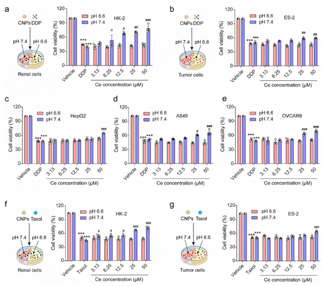 圖2 (a-e) DDP處理,不同濃度的CNPs在不同pH條件下,對HK-2、ES-2、HepG2、A549以及OVCAR8存活率的影響;(f, g) 不同pH條件紫杉醇處理后HK-2和ES-2細(xì)胞的存活率。