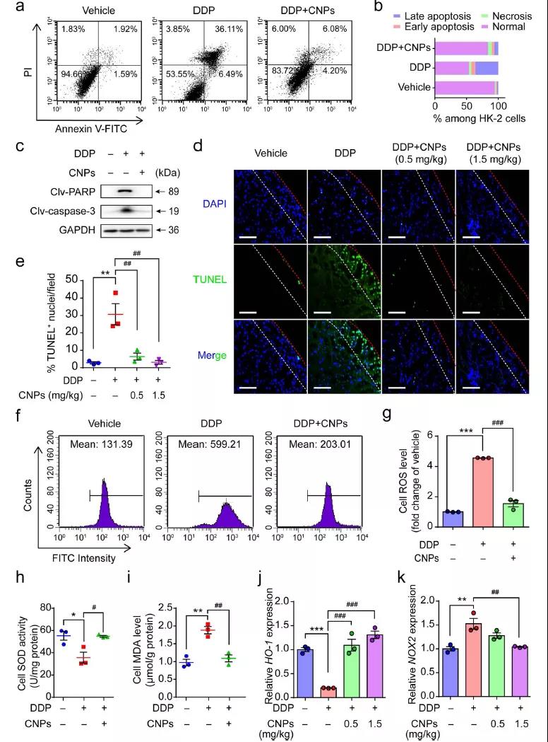 研究者們通過CNPs對于細(xì)胞凋亡信號的影響,來探索CNPs減輕AKI的機(jī)理。經(jīng)DDP處理后,HK-2細(xì)胞凋亡率、PARP和caspase-3表達(dá)顯著增加,但再經(jīng)CNPs處理后這些相關(guān)因素顯著下降。因而認(rèn)為CNPs可顯著降低DDP引起的TUNEL凋亡水平。ROS是誘導(dǎo)凋亡的關(guān)鍵因素,CNPs可以清除DDP誘導(dǎo)的內(nèi)源ROS,逆轉(zhuǎn)DDP對于SOD的抑制和MDA的升高。qRT-PCR分析表明CNPs可以降低DDP處理后的HO-1基因表達(dá),提高NOX2基因表達(dá),使它們的表達(dá)接近無DDP處理的原始水平。