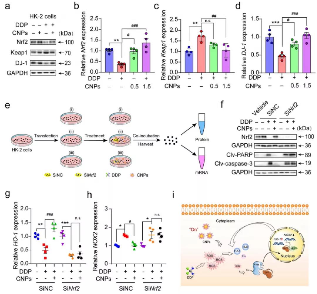 圖5 (a, b-d) 經(jīng)不同處理后HK-2細(xì)胞中的Nrf2, Keap1和DJ-1蛋白質(zhì)印跡分析及量化;(e-h) 利用小干擾RNA負(fù)調(diào)Nrf2后通過western blot和qRT-PCR分析相關(guān)基因的表達(dá)情況;(i) CNPs通過激活Nrf2/Keap1,對抗DDP引起的氧化應(yīng)激的細(xì)胞內(nèi)信號轉(zhuǎn)導(dǎo)示意圖。