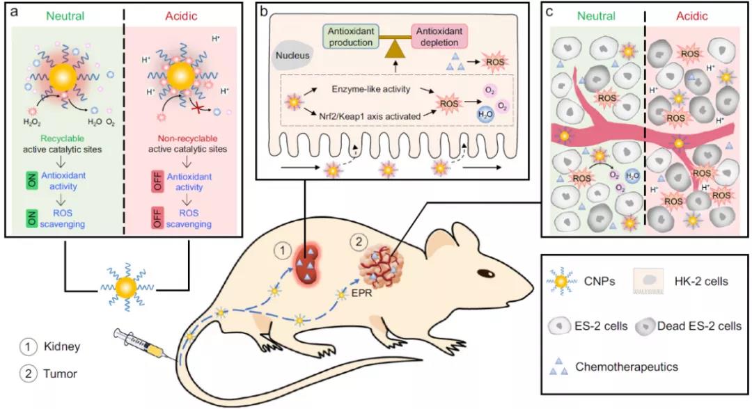 鑒于此,浙江大學(xué)凌代舜課題組在《Nature Communication》上發(fā)表了Catalytic activity tunable ceria nanoparticles prevent chemotherapy-induced acute kidney injury without interference with chemotherapeutics為題的研究,該研究設(shè)計(jì)了一種催化活性可調(diào)的二氧化鈰納米粒子(CNPs),可以防止化療引起的 AKI,但不會干擾化療作用。具體來說,在腎皮層中性環(huán)境中CNP催化分解H2O2,然后通過激活Nrf2/Keap1信號通路來調(diào)節(jié)與ROS有關(guān)的基因表達(dá),恢復(fù)ROS平衡保護(hù)腎小管;在腫瘤酸性微環(huán)境下,CNP由于高濃度的H+破壞了其活性催化位點(diǎn)進(jìn)而限制其的抗氧化作用,從而不干擾化療生成的ROS來殺死癌細(xì)胞。作為 ROS調(diào)節(jié)劑,CNP這種條件依賴型可調(diào)的催化活性,在癌癥患者的 AKI 臨床預(yù)防和治療方面具有巨大潛力。