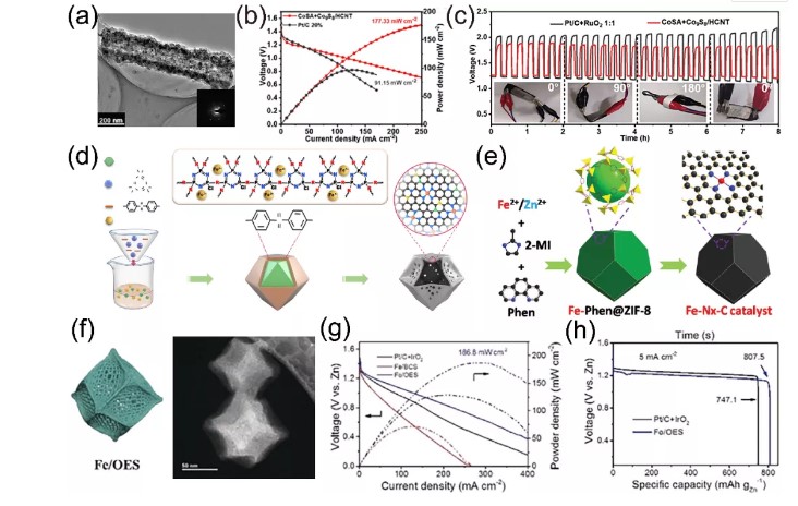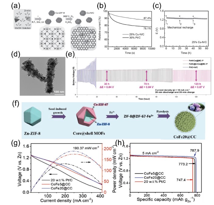 圖3. (a-c) Cu-N/C催化劑的合成工藝、ORR電流-時間響應和鋅-空氣電池性能;(d) FeNiCo@NC-P催化劑的TEM圖像;(e) FeNiCo@NC-P應用在鋅-空氣電池的循環穩定性;(f-h) 形成刺繡球形結構的開放式碳籠的合成示意圖、功率密度圖和鋅-空氣電池比容量。