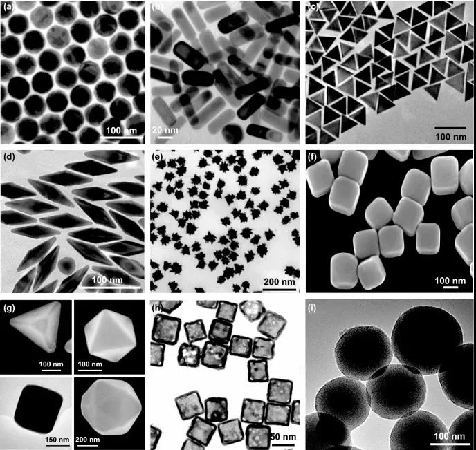 圖1. 采用自下而上的方法合成具有不同形狀的AuNP。(a) 球,(b) 棒,(c) 棱鏡,(d) 雙錐,(e) 星,(f) 立方體,(g) 多邊形納米晶體, (h) 籠,(i) 金@二氧化硅雜化納米顆粒