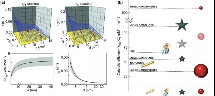 圖2. 不同粒徑和形狀AuNPs催化效率的比較。(a) 不同粒徑AuNPs催化resazurin還原為resorufin的動力學研究。它顯示了NP大小如何影響表面重構率與催化產物形成(左上)和產物離解(右上)的轉化率的關系,以及NP大小與活化能(左下)和自發動態表面重構率(右下)的關系,(b) 比較不同形狀和大小的AuNP對類過氧化物酶活性的催化效率。HRP,它們的生物學對應物,也包括在圖表中。