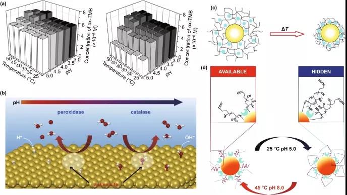 圖3. AuNPs不同催化活性對pH和溫度的依賴性。(a) 涂有不同濃度相同肽(左側高3倍)的AUNP對溫度和pH變化的反應不同,因為它們具有類似過氧化物酶的氧化3,3′,5,5′-四甲基聯苯胺(TMB)的能力,(b) 金納米粒子在堿性條件下吸附于金表面,表現出不同的H₂O₂分解途徑,(c) 用于穩定AuNPs的熱敏性聚合物層可能經歷結構變化,從而阻止納米材料的催化活性狀態,(d) “開/關”納米酶通過溫度和pH值變化進行控制,從而通過AuNP表面聚合物鏈之間的氫鍵形成籠狀結構。